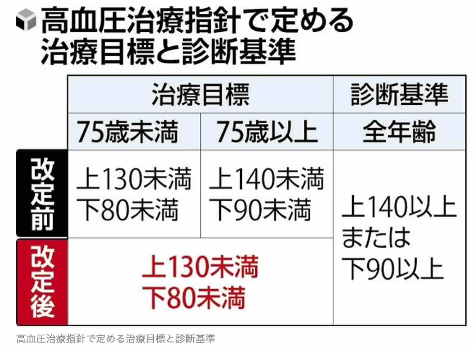 日本高血圧学会は、高血圧の治療で血圧を下げる際の目標値について、75歳以上で上の血圧(収縮期)と下の血圧(拡張期)をこれまでより10引き下げ、上130、下80未満に抑える新たな治療指針を発表した。75歳以上の場合、血圧の下げ過ぎによる転倒リスクなどから、目標値が高めに設定されていたが、血圧を下げることで、脳卒中などの予防効果が高いと判断した。